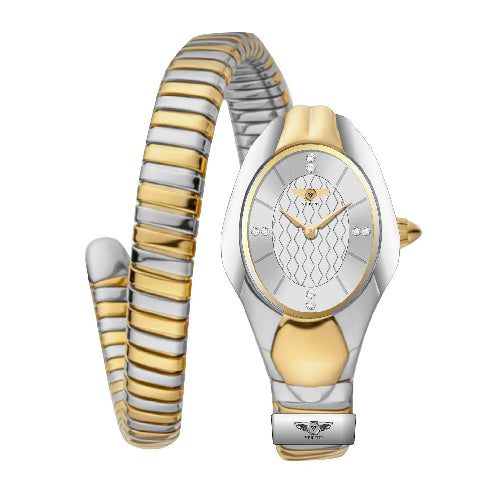 تُجسّد ساعة فيروتي 1035-3 سيربنتي أرجينتو إديشن رقيًا خالدًا بتصميمها الإيطالي المُستوحى. سوارها الملفوف ثنائي اللون، المصنوع من الفضة المصقولة والفولاذ المقاوم للصدأ الذهبي، يُحيط بالمعصم بأناقة، بينما يُضفي ميناءها البيضاوي الفضي المُزوّد بعلامات الساعات الكريستالية لمسةً من الرقي. يُضفي الإطار الذهبي لمسةً فاخرة، مُوازنًا بين الأناقة واللمسة العصرية.
