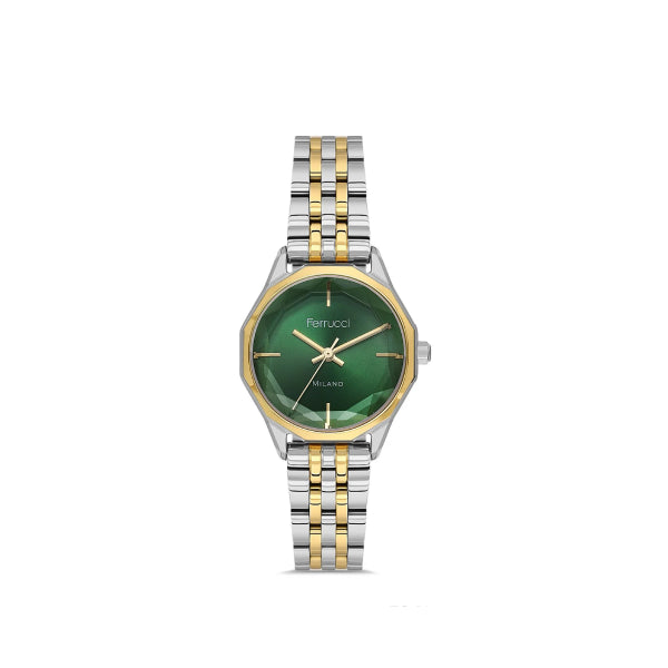 Ferrucci FC 03383M-03 represents contemporary watchmaking excellence designed specifically for women. This timepiece features a striking green dial that commands attention while maintaining sophisticated elegance. The dual-tone case combines lustrous gold and silver finishes, creating a versatile aesthetic that transitions seamlessly from professional settings to evening occasions. Part of the latest collection, this model showcases refined craftsmanship and modern design sensibilities. The balanced color palette and distinctive dial make it an exceptional choice for those seeking a distinctive accessory that combines style with reliable timekeeping performance.